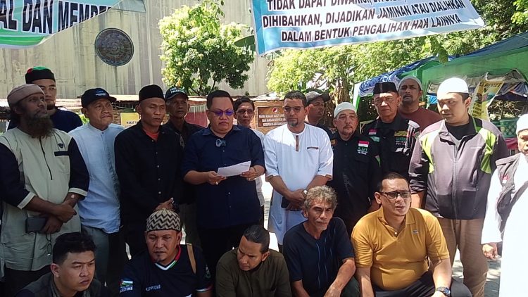 Tim Advokasi Masyarakat Pembela Tanah Wakaf Sumut yang juga di Tim Hukum TPUA Sumut, Akhyar Idris Sagala, SH, dan Ade Lesmana, SH usai menaikkan spanduk dukungan, dalam keterangannya langsung memberikan lima point Pernyataan sikap resmi yakni ;
