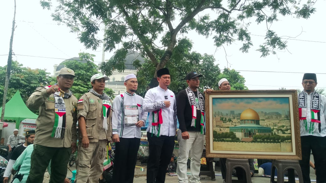 Bahwa Aksi kita ini adalah sebagai bagian dari ikhtiar kita untuk mempersatukan umat menguatkan ukhuwah, menguatkan barisan kita atas perjuangan kita yang belum selesai dan mungkin juga tidak akan selesai yaitu pembelaan kemerdekaan atas rakyat Palestina, dengan Memboikot semua produk produk yang terafiliasi dengan Israel laknatullah, ” ucapnya