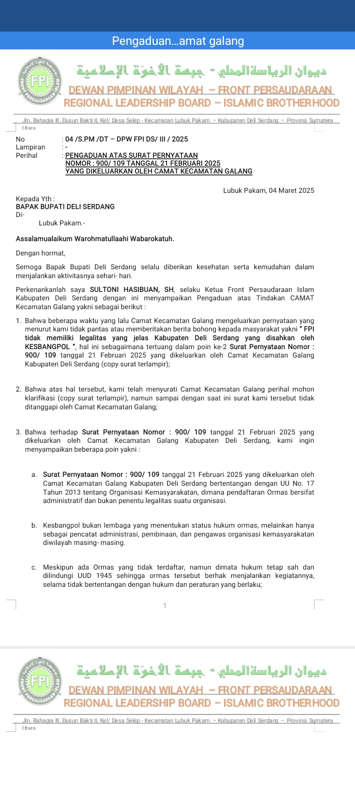 Surat Pengaduan Kpd Bupati Deli Serdang, terkait di Abaikan nya Laporan DPW FPI Deli Serdanga atas Surat yg di keluarkan Camat Galang.
