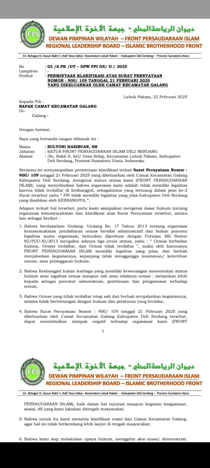 Sultoni Hasibuan, SH Selaku Ketua DPW Deli Serdang saat Dikonformasi medansumutpos.id, Mengatakan bahwa kami jajaran FPI Deli Serdang meminta agar  Bupati Deli Serdang Melakukan Tindakan Tegas terhadap Camat Galang yang secara terang-terangan melalui Surat Pernyataan nya telah berkata BOHONG dan Menyesatkan Dengan Mengatakan FPI tidak memiliki Legalitas, ” Tandasnya. ( Red )