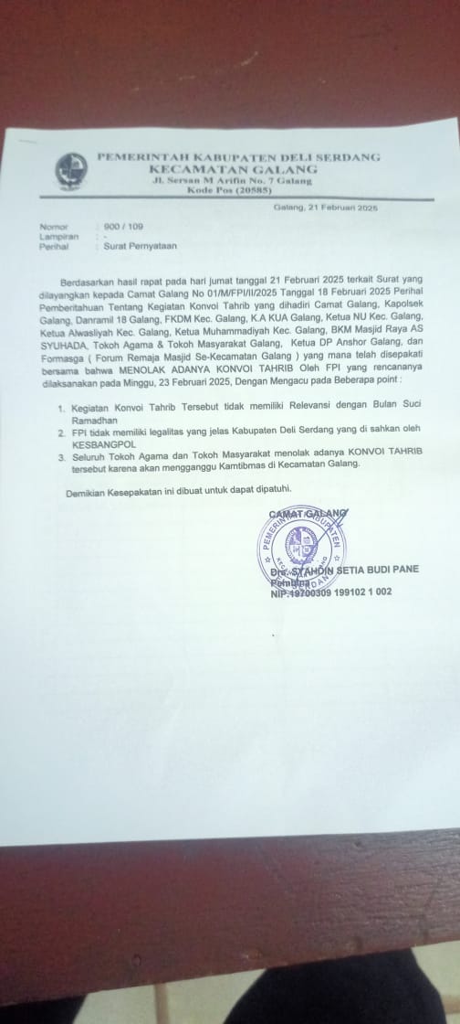 Tags: Berawal dari Rencana DPC FPI Galang yang Mengadakan Kegiatan Tarhib RamadhanCamat Galang Sebarkan Berita Bohong Terkait Tarhib Ramadhan FPIDPW FPI Kabupaten Deli Serdang juga Kembali Menyurati BUPATI DELI SERDANGkonfirmasi atas Maksud dari Camat Galangsurat pernyataan dari Camat Galang dengan nomor 900/109 yang di Keluarkan Camat Galang ter tanggal 21 Februari 2025