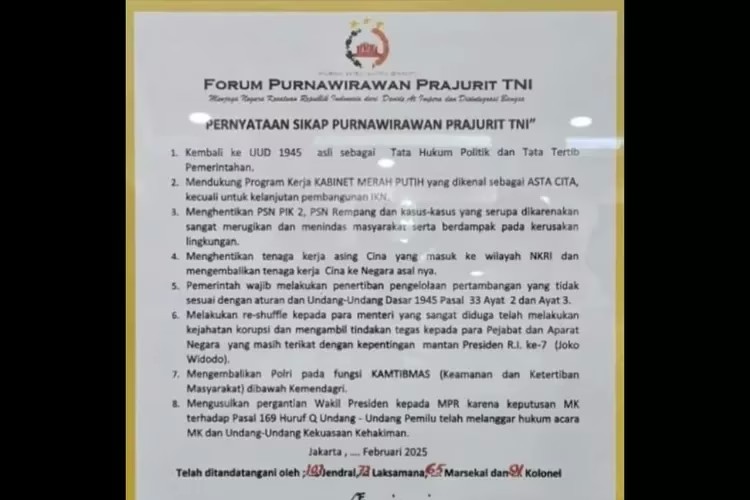 Dokumen pernyataan sikap dibingkai dengan latar belakang gambar bendera merah putih bertulisan, “Kami Forum Purnawirawan Prajurit TNI Mendukung Presiden Prabowo Subianto Menyalematkan NKRI”. Selain pergantian Wapres Gibran, tuntutan mereka juga mendesak Polri berada di bawah Kementerian Dalam Negeri (Kemendagri).