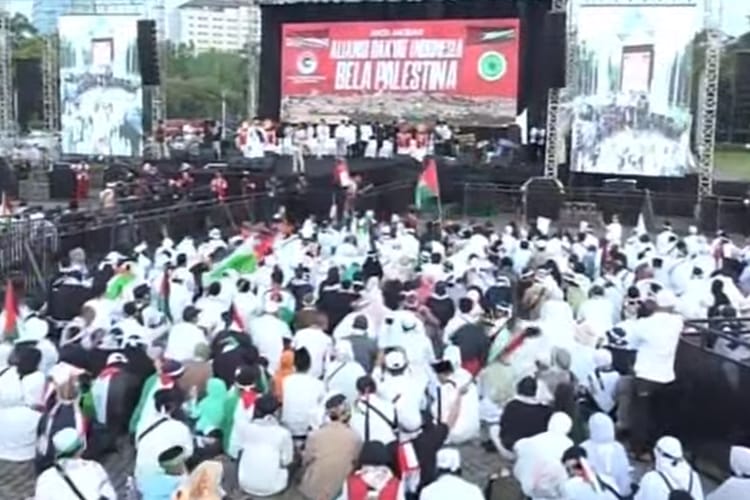 Aksi bela Palestina dimulai dengan menyanyikan lagu kebangsaan Indonesia Raya dan pembacaan Undang-Undang Dasar 1945.