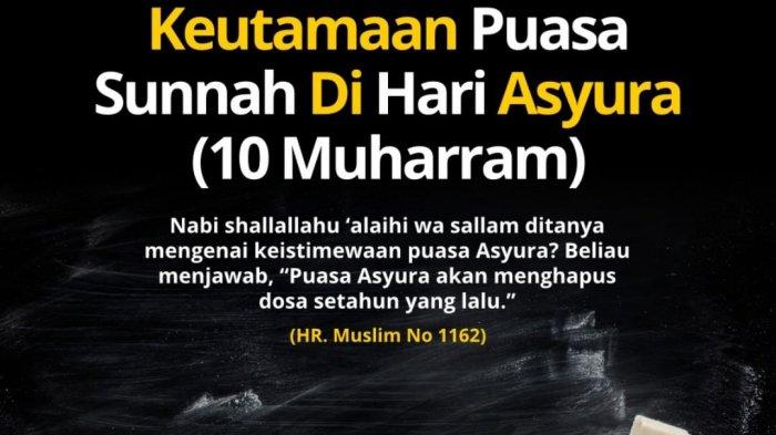 Rasulullah SAW bersabda: “Barang siapa berpuasa di hari Asyura (10 Muharram), maka Allah SWT memberinya pahala 10.000 malaikat. Dan, barang siapa berpuasa di hari Asyura (10 Muharram), maka ia diberi pahala 10.000 orang berhaji dan berumrah dan 10.000 pahala orang mati syahid. Barangsiapa mengusap kepala anak- anak yatim di hari tersebut, maka Allah SWT menaikkan dengan setiap rambut satu derajat. Barangsiapa memberi makan kepada orang mukmin yang berbuka puasa di hari Asyura, maka seolah-olah ia memberi makan seluruh umat Rasulullah SAW yang berbuka puasa dan mengenyangkan perut mereka.” 1
