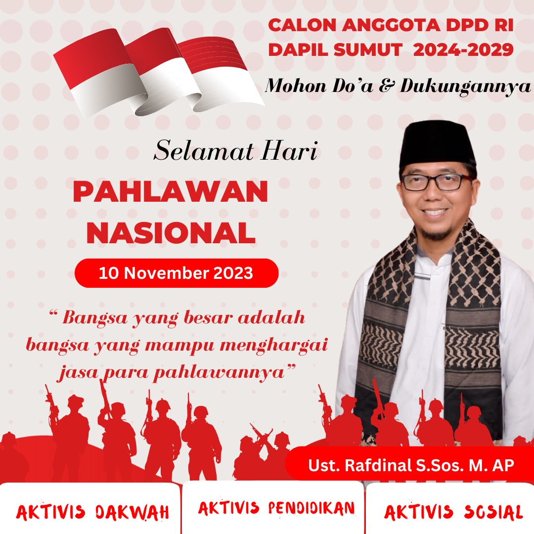 Calon Anggota DPD-RI Dapil Sumut, Ustadz Rafdinal, S.Sos, M.AP menilai, para elit bangsa saat ini baik di eksekutif, legislatif, dan yudikatif di semua komponen kelembagaan negara atau pemerintahan maupun non pemerintah, dalam momen Hari Pahlawan perlu kembali melakukan napak tilas sejarah bangsa ini.
