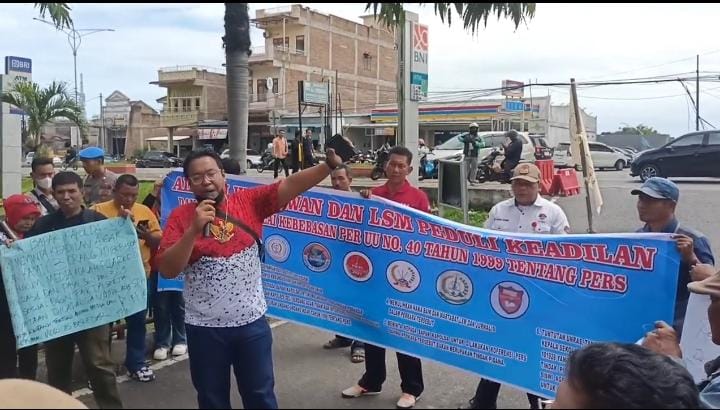 Puluhan wartawan dan aktivis LSM yang tergabung dalam Aliansi Wartawan dan LSM Peduli Keadilan menggelar aksi unjuk rasa menuntut keadilan atas penahanan tiga rekannya yang dinilai sarat kejanggalan hukum.